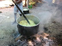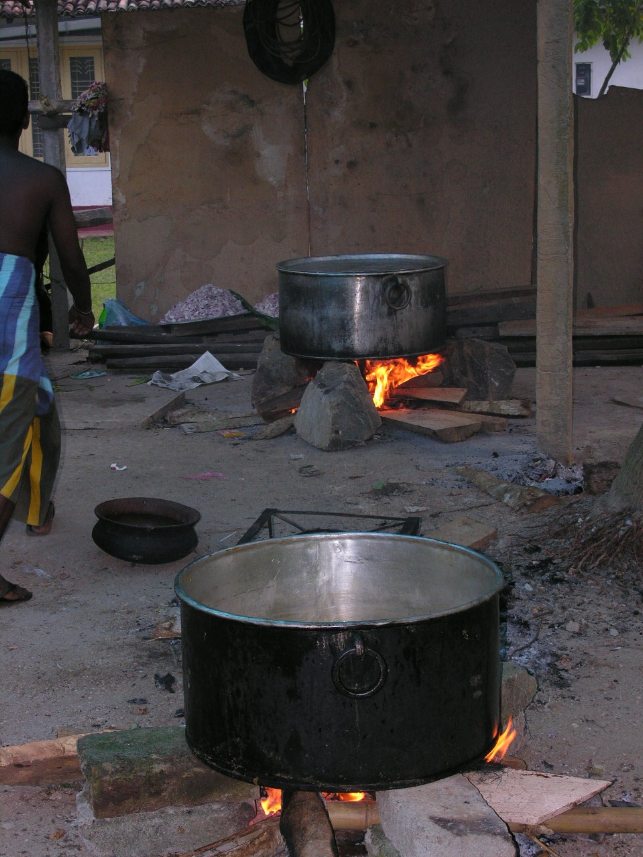 An mehreren offenen Feuerstellen wurde in grossen Kochtöpfen gekocht.